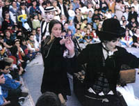 de una bella mujer. Los actores se caracterizan para convertirse en Charlot,